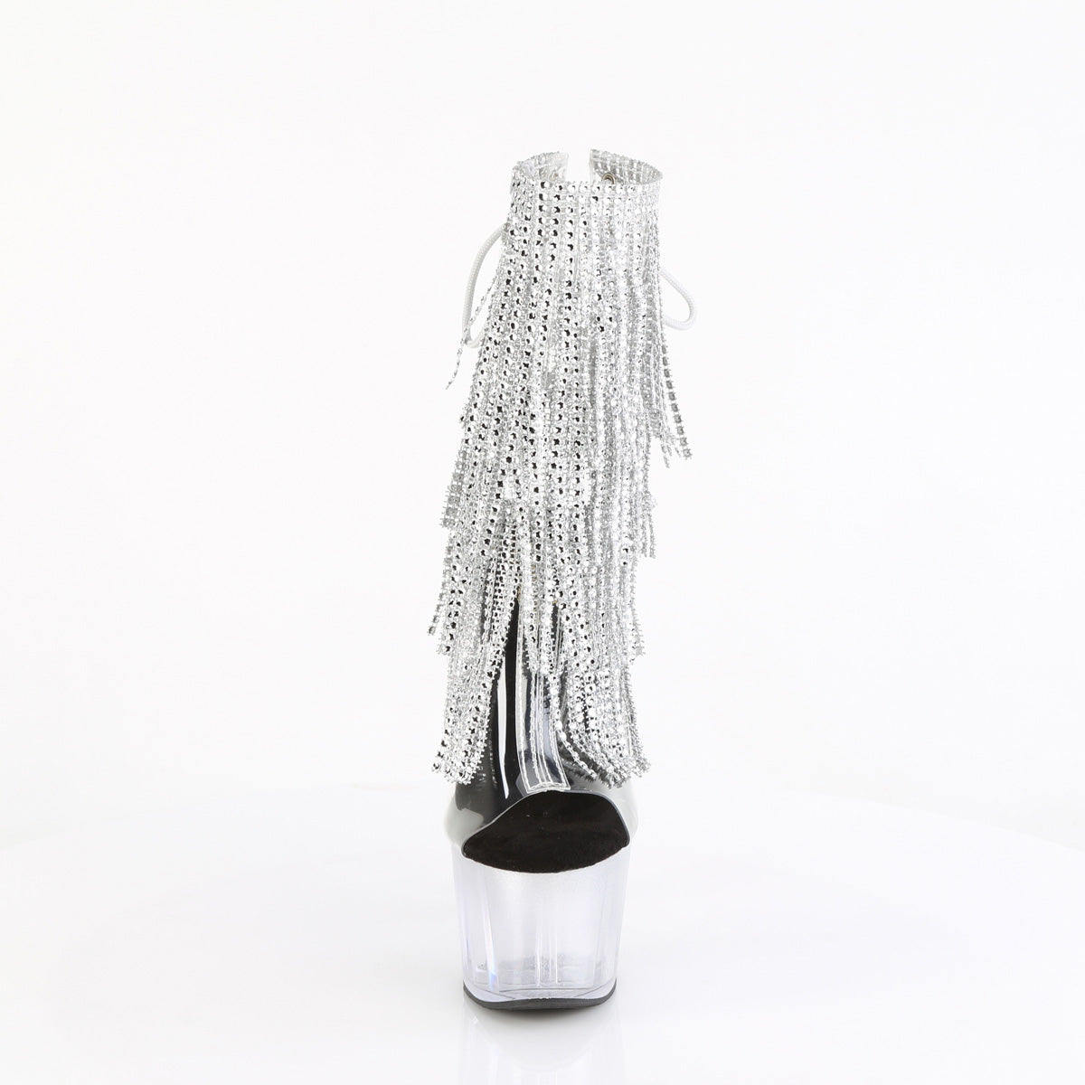 | Description | 7-Zoll-Ferse, 2 3/4-Zoll-Plattform-Plattform offener Zehen- / Fersen-Lace-up-Fransen-Knöchelstiefel |