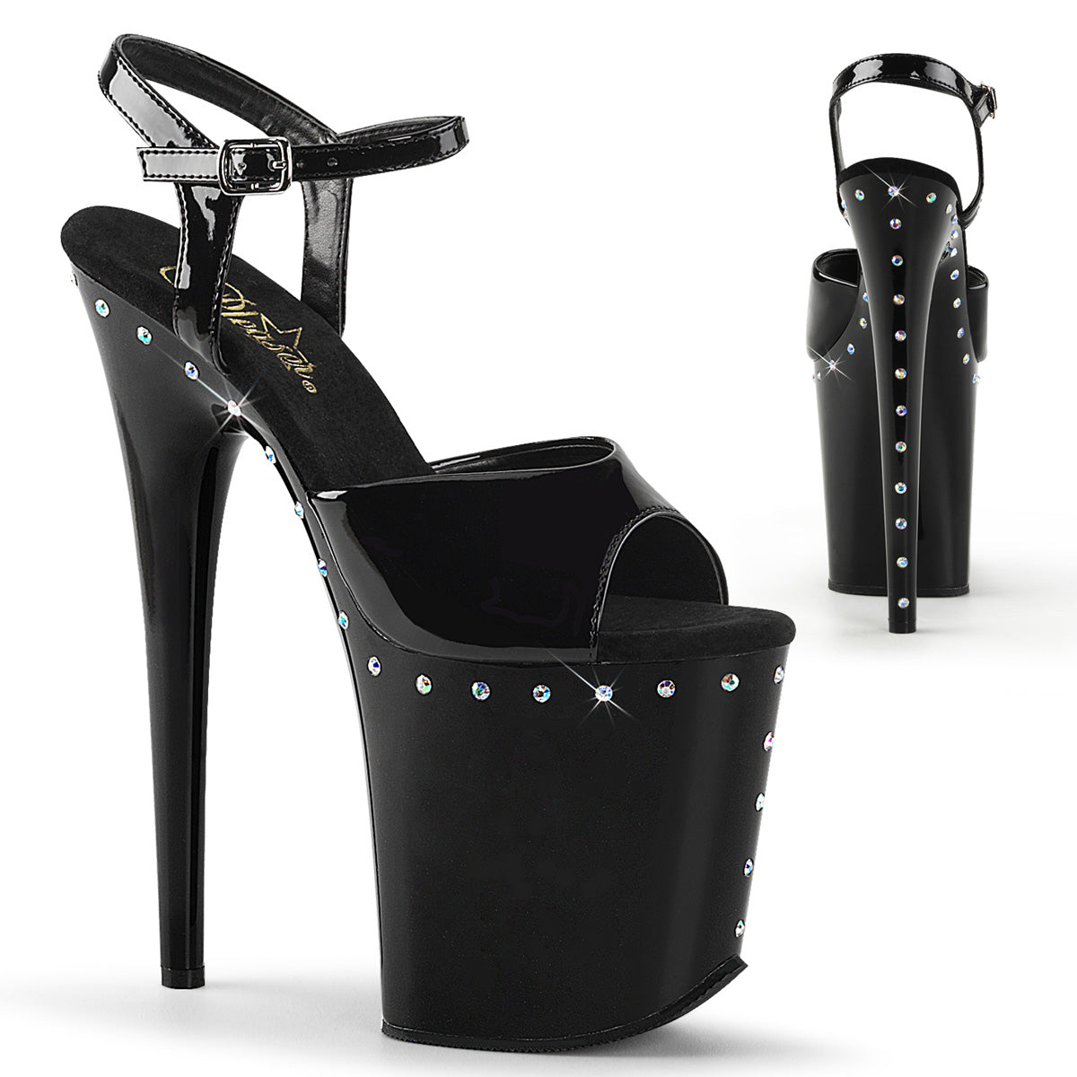 | Description | 8 "" (20,3 cm) Stiletto Ferse, 4 "" (10,2 cm) Plattform Knöchelband Sandale mit abgesäumten Strasssteinen auf der Plattform |