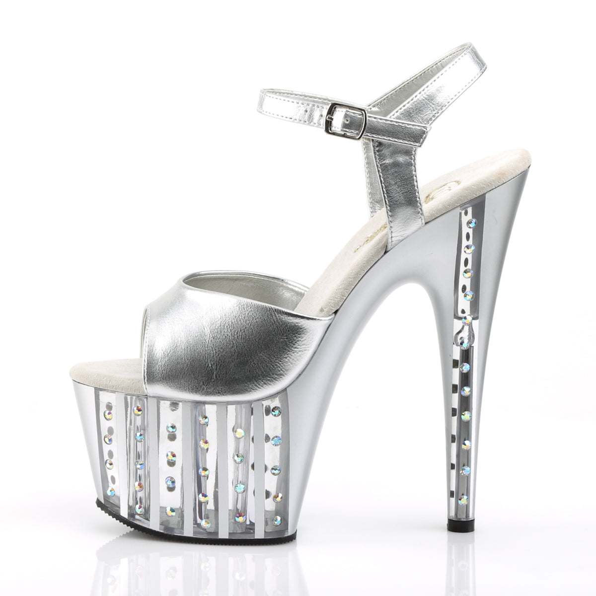 Additional Description 7"" (17.8cm) Stiletto Heel, 2 3/4"" (7cm) Platform Ankle Strap Sandal Featuring Rhinestone Lined Platform
