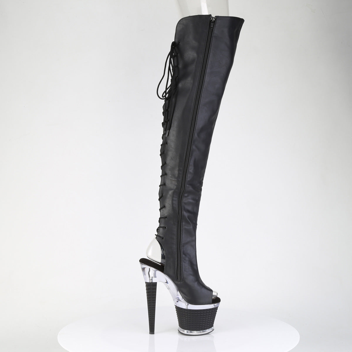 7"" (178mm) Heel, 3"" (76mm) Textured PF Open Toe/Heel Lace-Up Back Thigh High Boot, Full Length Inner Side Zip Closure